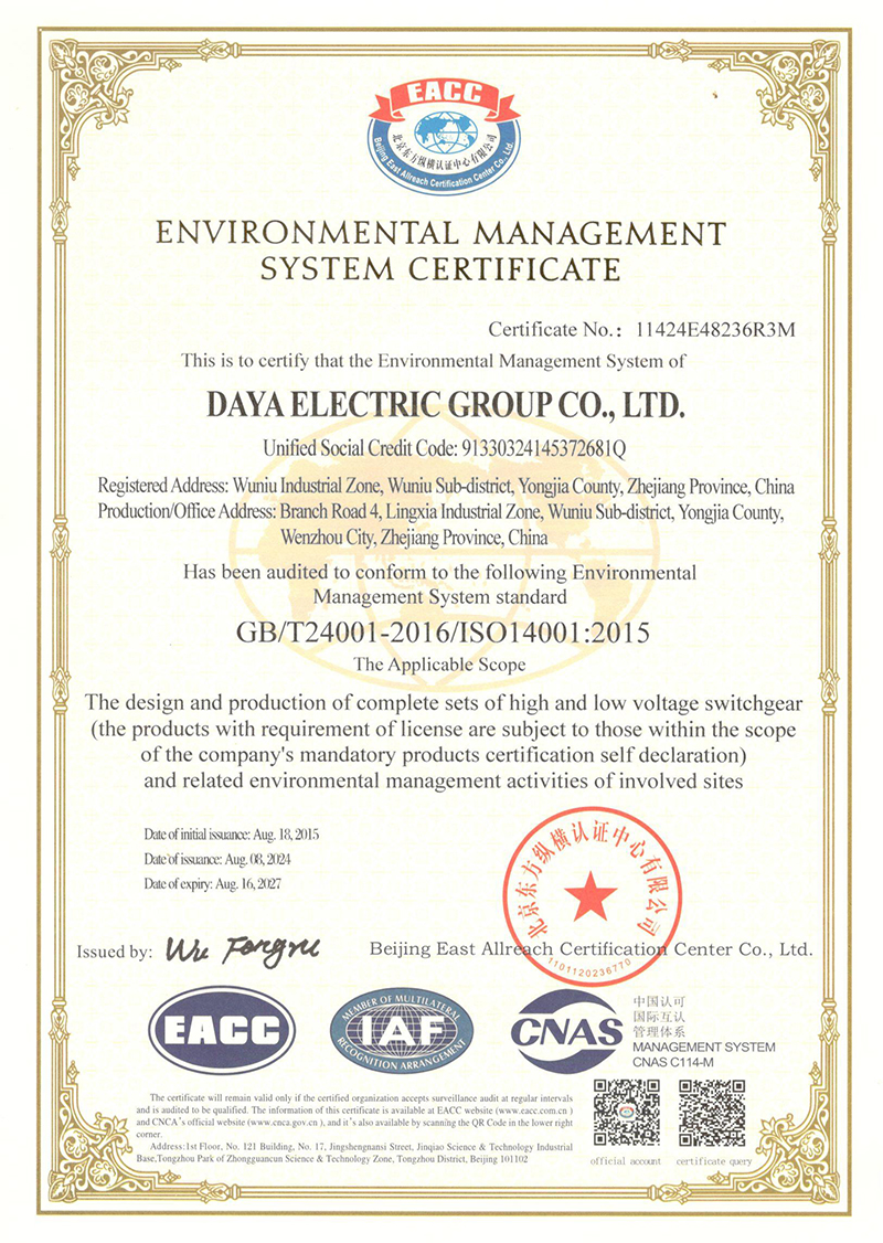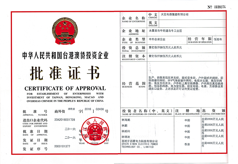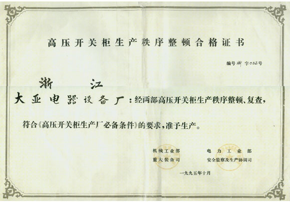 Certificate of Conformity for Rectification of Production Order of High Voltage Switchgear
