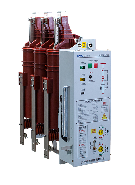 DHZN-12GD系列户内高压三工位真空断路器主回路纵向布置,上部为隔离开关、中部为真空断路器、下部为接地开关, 操作机构、断路器机构、联锁机构位于开关前部。本开关可以倒安装。